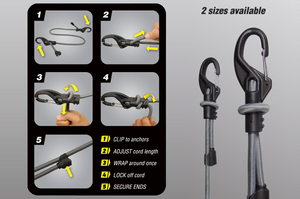 The innovative carabiner ends of our KnotBone Adjustable Bungee allow you to adjust and lock its cord length precisely for each individual job. It's a little bit evolution, a little bit intelligent design, and a whole lot handy.